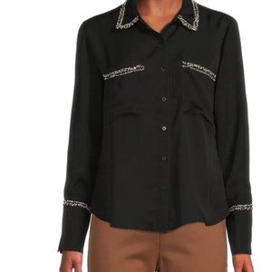 Worn only once. Like new condition. Textured bouclé trims detail this shirt giving it an eye-catching appeal. Point collar Long sleeves Button cuffs Button front Bouclé trim Chest slip pockets Shirttail hem Polyester Machine wash Imported