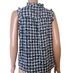 women’s blouse, sleeveless ruffle top, black white gingham, checkered floral print, button front shirt, lightweight summer blouse, office casual top, feminine ruffle blouse, v-neck sleeveless shirt, chic stylish tank top