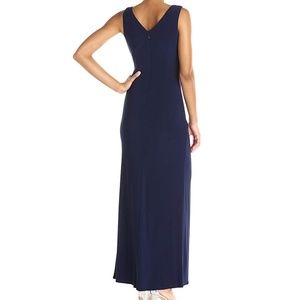 Beautiful Laundry by Shelli Segal gown. Has a leg slit. Size 0. The color is "inkblot" and it's a very dark navy/black color. I believe the true color is Closer to black but sometimes it photographs as dark navy with flash. Has beautiful jewels on the front. Worn twice for fancy weddings. Has been dry cleaned! In good preowned condition.