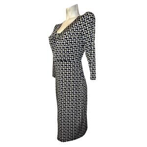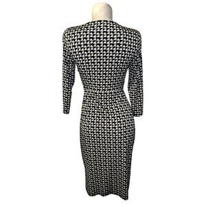 The LAUNDRY By Design Dress in size 4 is a multicolored geometric sheath dress with a keyhole cutout detail. Made from polyester and spandex, the dress features a V-neckline, 3/4 sleeves, and a zipper closure. Suitable for various occasions such as travel, weddings, parties, workwear, and formal events, the dress is designed for comfort and style. The colorful geometric pattern and liquid knit fabric give the dress a modern, yet retro feel, perfect for all seasons.