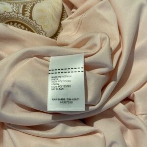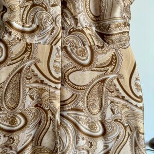 Gorgeous satin dress in beautiful neutral paisley pattern. LAUNDRY by Shelli Segal, size 4. Halter style ties at back of neck; covered back with slit above zipper + hook and eye close. Great cocktail styling makes a perfect wedding guest dress; fit ‘n flare swing skirt is lovely for dancing. Midi length hits at or just below knee. Fully lined in blush color. In excellent pre-owned condition.