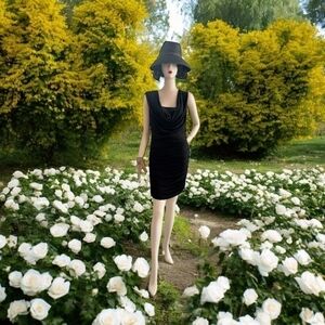Discover the chic sophistication of the LAUNDRY by Design Black Cowl Neck Drape Dress. This women's dress, worn only once and in excellent condition, features a stunning cowl neckline with a sequin underlay, adding a touch of sparkle and glamour. Perfectly lined for comfort, it offers a stretchy fit with a shell composition of 95% Polyester and 5% Spandex, and a 100% Polyester lining.