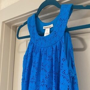 Great condition! Adorable lace sleeveless dress with eyelet overlay. Fully lined. Length: 34” Bust: 32”