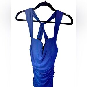 A gorgeous deep royal blue midi dress with ruched sides and boned bodice that give this body on a allover slimming effect. Lightly padded bust and halter neckline with a signature styled cross in the back for a stand out detail. Zip side closure and fully lined.