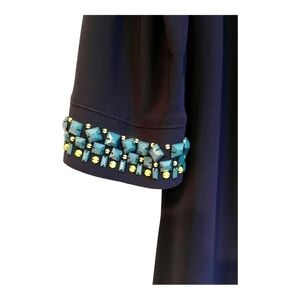 LAUNDRY by SHELLI SEGAL, LOS ANGELES, NAVY BLUE, LINED SHIFT WITH 3/4 SLEEVE. CUTOUT BACK. DECORATIVE STONE DETAIL AT CUFFS. SHOULDER PADS. IN EXCELLENT CONDITION. SIZE 10.