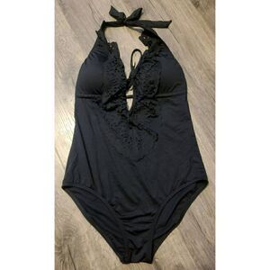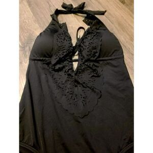 Like new and is a gorgeous suit. Has some padding on top and full coverage on botttom. Ruffled at V in front & ties around neck & mid back. No damage of any kind. Comes from a smoke-free / pet-free home. Carefully packaged and shipped next day.