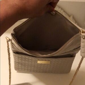 Italy Genuine leather crossbody bag with long gold chain . Very unique bag with texture leathers zipper in the frond with 8 big slot for cards and three compartment . High quality chain makes this bag more attractive . Great color for any seasons . No rips or damages just a little normal sign of wear in the bag which is not noticeable .