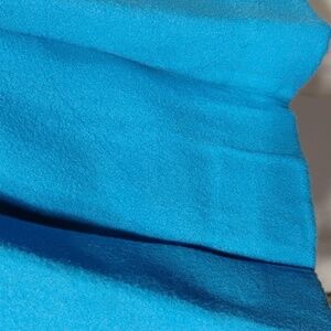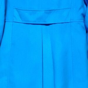 this is a gorgeous jacket by Laura Scott it's in a beautiful blue color almost like a Wedgewood to a light blue to a turquoise mix it has buttons up the front that are in like a tortoise shell color it's got the beautiful pleats right under the bus line and it's got the two front pockets that come in from the side. the back has the of course the collar with the point then the back has a where the shoulders has a nice stitching line across and it has two stitches going down all the way down and it has the strap of the same material going across and it's also got the closed pleat that opens but still stays closed it does not have an opening.  this is a size large in women the measurements lying flat pit to pit are approximately 22.5 in and the length from top to bottom is 32 to 33 in beautiful jacket this jacket retails for $100 and it's like brand spanking new. it's made from 100% polyester inside and out but it does say dry clean on it but I think you could wash it.