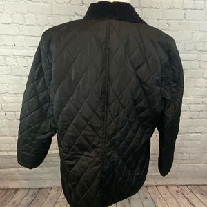 EUC Black quilted jacket with corduroy trim on collar and along pocket openings. Two pockets, snap front closure, checkered plaid interior. 100% polyester. Measures 22" pit to pit and 26.5" shoulder to hem. (Box 3)