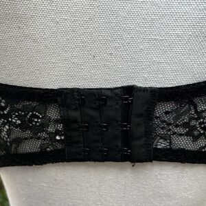 From Laura Ashley, a black lace bralette in Women’s size Large. Unlined. Wire free. Boning at the sides.