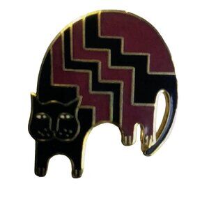 Distinctive and collectible 1980s Laurel Burch “Aztec Cat” cloisonné brooch, featuring bold burgundy and black zigzag enamel with gold-tone brass trim. Signed on reverse. Charming, geometric feline design — classic of Laurel Burch’s early art jewelry era.