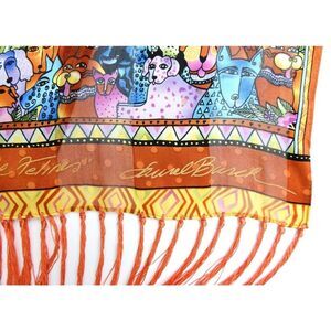 Semi sheer fringe scarf Canines and Felines by Laurel Burch. 11.5"x53"(without fringe). The fringe is 5.5". Excellent condition. No rips, no holes, no snags, no stains.