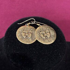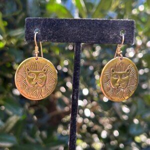 • Unique Vintage 1980s “Laurel Burch” Hallmarked Gold-Plated Lion or Cat Etched Face Disc Dangling Pierced Earrings