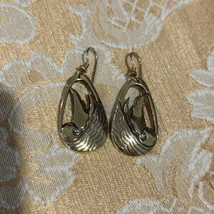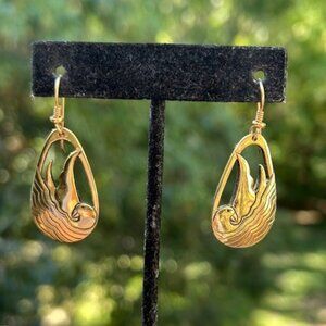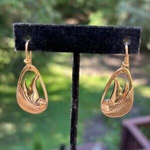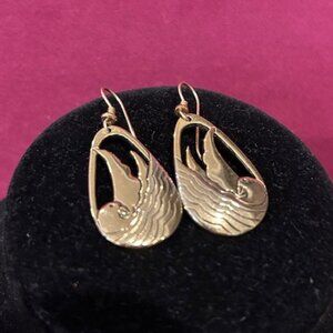 • Unique Vintage 1980s “Laurel Burch” Hallmarked Gold-Plated Seabird Modernist Etched Dangle Pierced Earrings
