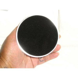 3 3/8" in diameter, about 2" tall. Weighs 1 lb 5 oz unpacked.
