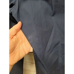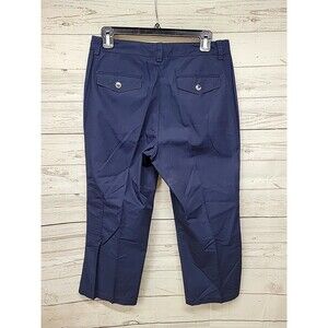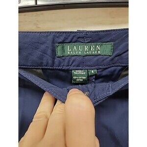 Lauren Ralph Lauren capri length pants in women's size 4. Solid navy blue with side pockets and zipper pockets. 100% cotton material. Faint blemish on back leg. I think it's a surface stain and will wash out.