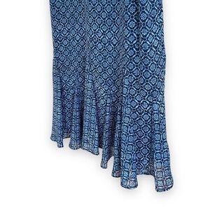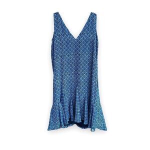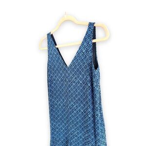 Straight sheath fit through the body with pleated flare at the bottom. Roughly knee length (on me, and I am 5’4”). Navy background with bright blue Diamond and abstract floral pattern (see photos). From a distance, the dress looks almost indigo. V neckline on front and back. Sleeveless. Made from 2 layers of sheer fabric and is not noticeable see-through. Fabric is a navy lining with patterned fabric overlay.