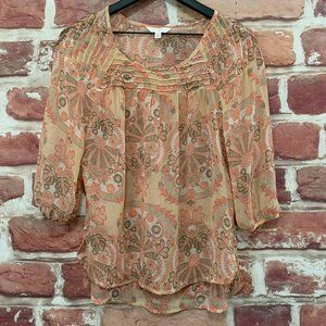 ▪️Women’s top. Scoop neckline, pullover, Bohemian style floral pattern, chiffon texture, pleated upper bodice, semi-sheer, and long button up sleeves. Pre-owned. Wear it with your favorite pants!