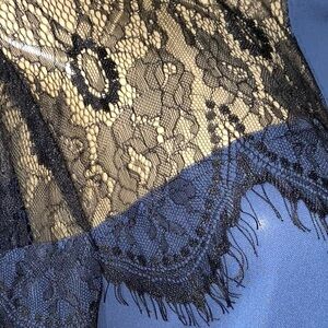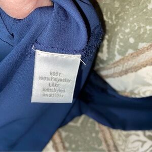 LAUREN Conrad classy navy blouse enhanced by lace shoulders and hidden buttons.
