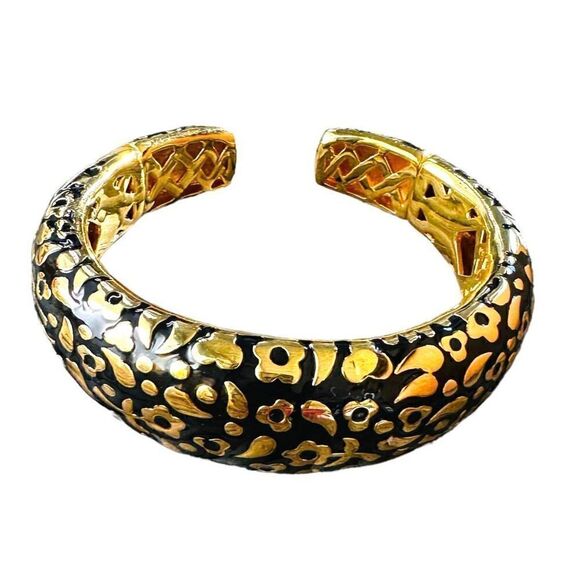 Part of the Flowers by Orly collection, this flower design cuff is crafted of a solid brass base and plated with 18k gold. It features finely hand painted Black enamel elements for a classic look.
