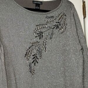 This Lauren Michelle sweater would be a beautiful way to dress for the holidays when everyone else is wearing ugly Christmas sweaters! It's very soft despite the silver lame' look and all of the embellishments appear to be intact.