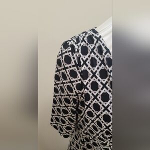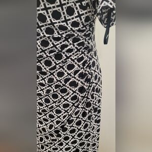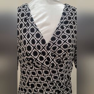 Lauren - Ralph Lauren black and white dress (sz 12). There is a gathering on the left side . There is also a little gathering at the shoulder line. Measurement from underarm to hemline is 31-1/2". Chest measurement across the front is 18". The dress has a flap on the left side. The dress is in excellent condition. Please see all pictures.