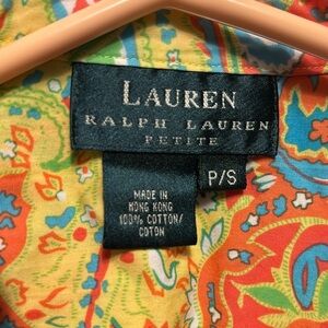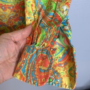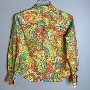 Brightly colored paisley button front blouse. Armpit to armpit 19” Length 24 1/2” 100% cotton. On sleeves has three buttons. Yellow, orange, turquoise, green and white colors. Excellent condition