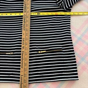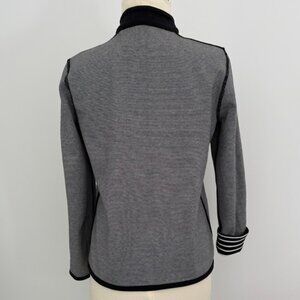 LAUREN RALPH LAUREN Black & White Reversible Striped Jacket. Large stripe side has Zip Front with gold zippers up front and on pockets. The small stripe side has patch pockets. It is a nice thick knit fabric that retains its shape. Snap at collar. Roll up the sleeves to show the other print.