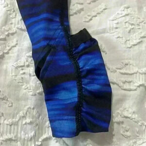 This quarter zip pull over is perfect for your workouts. It features thumb holes and it blew and black striped camo pattern. There is elastic at the bottom near the waist. See pictures for measurements and details. This item is an excellent condition with no rips, stains or tears.