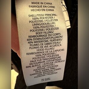 Material: Shell/Lining: 100% Polyester. Filling: 60% Duck Down, 40% Feather. Faux Fur Trim: 64% Acrylic, 20% Modacrylic, 16% Polyester