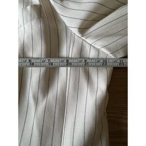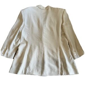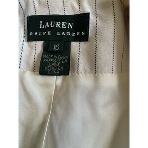 The Lauren Ralph Lauren Blazer is a stylish and versatile piece made from 100%. This size 16 blazer features a classic pinstriped design in a beige color, making it suitable for various occasions such as travel, casual outings, formal events, workwear, and business meetings. The vintage style of this basic jacket adds a touch of sophistication to any outfit, making it a timeless and high-quality addition to any woman's wardrobe.