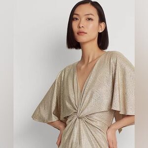 A fluid cape and a twist-front accent bring contemporary elegance to Lauren Ralph Lauren's statuesque gown. Cutouts at the bodice accentuate the natural curves of the waist, while a foil-print jersey construction lends a metallic sheen.