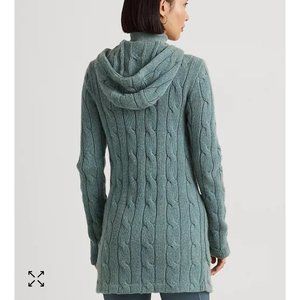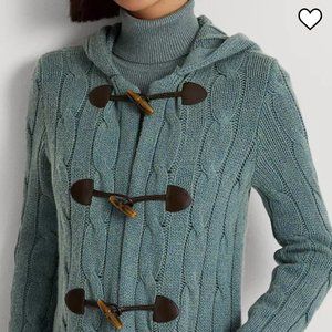 Crafted from a cozy wool blend, Lauren Ralph Lauren's cable-knit sweater-coat hybrid is designed with a hooded silhouette and a sophisticated faux-leather toggle-and-loop closure.