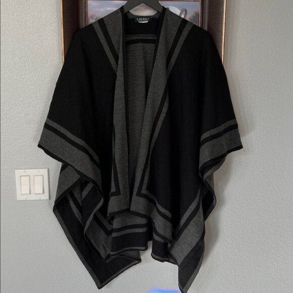 LAUREN RALPH LAUREN Jet Setter Reversible Knit Poncho Wrap Black Gray OS (EUC)