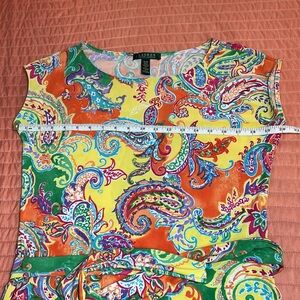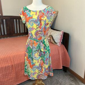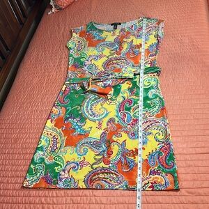 EUC bright and soft LAUREN RALPH LAUREN Multicolor Paisley Knit Belted Sheath Dress size Medium