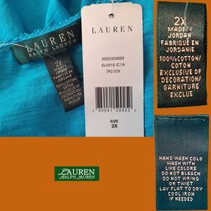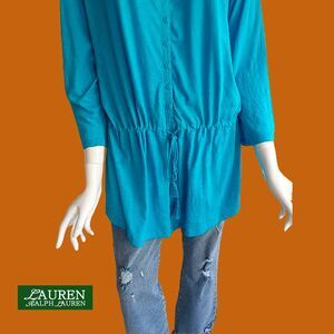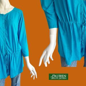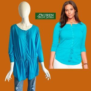 LAUREN RALPH LAUREN |NEW| Tassel Drawcord Loop Trim 3/4 Sleeves Tunic Top 2X. Delicate looped trim adds a sweet touch to the collarbone-skimming neckline of a soft cotton tunic cinched with a tasseled drawstring for flattering definition. Three-quarter sleeves and a nine-button placket detail the pretty design. It is made with excellent quality by LAUREN RALPH LAUREN. See pictures for all details and the Table Chart in the pics to size this top. Specific measurements are provided upon request.