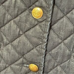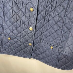 Navy blue lightweight quilted jacket with button-front closures, 2 button-closure pockets and 3/4 length sleeves. Replaced a missing button with a J.Crew button (see close-up photo).