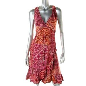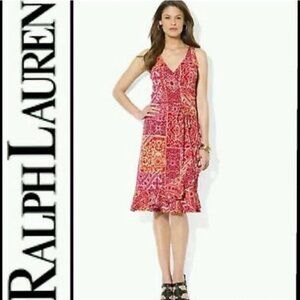 LAUREN RALPH LAUREN Red Pink Tan Sleeveless Patchwork Print Faux Wrap Dress Sz L
