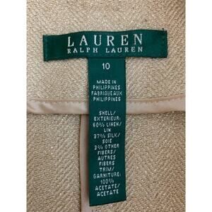 LAUREN RALPH LAUREN Women size 10 Gold Tan Metallic Linen & Silk Safari Jacket in excellent preowned condition, no noticeable flaws. See all photos for details and condition. MATERIAL: 60% Linen, 37% Silk, 3% Other fibers COLOR: Tan gold FEATURES: Unlined, gold flecked herringbone silk and linen blend material, all safari jacket features such as pleated button flap pockets, belted waist, epaulettes on shoulders, tortoise shell buttons and belt buckle. Armpit to armpit: 19" Shoulder seam to shoulder seam: 16" Back collar to hem: 25" Sleeve length: 25"