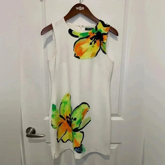 LAUREN RALPH LAUREN Womens Floral Print Sleeveless Wear to Work Dress White 8P fully lined.
