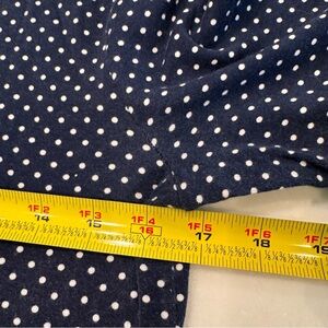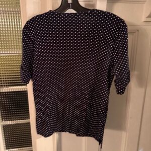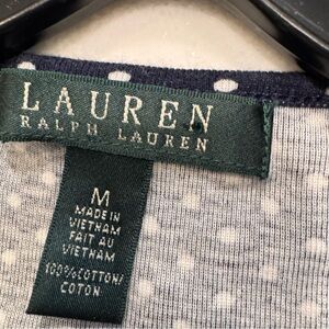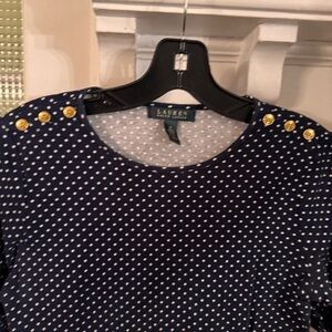 Excellent condition. Women’s Lauren Ralph Lauren navy blue with white polka dots top. Short cuffed sleeves, round neck, gold shoulder buttons. Size medium. See photos for measurements