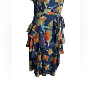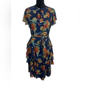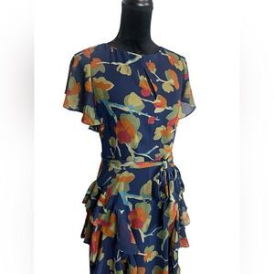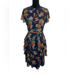 Keywords: Lauren Ralph Lauren, floral dress, ruffle-trim, georgette, midi dress, multicolor, party dress, cocktail dress, elegant, feminine, V-neck, belted waist, layered skirt, spring fashion, pre-owned.