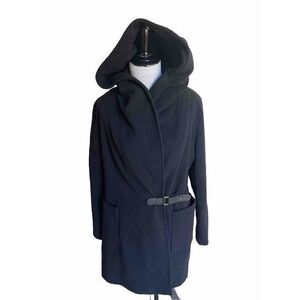 LAUREN RALPH Womens Hooded Black Wool Blend Belted Pea Coat Jacket Size 2