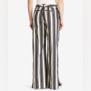 These LAUREN Ralph Lauren navy and beige vertical stripe pattern split leg trousers, size 12, offering a vintage-inspired look. Crafted with a high-waisted design and a split hem, they provide a sophisticated and modern silhouette. Ideal for making a statement at formal occasions or stylish events.