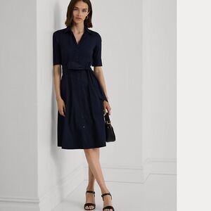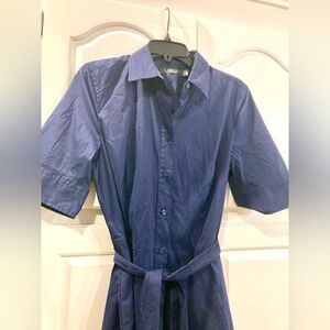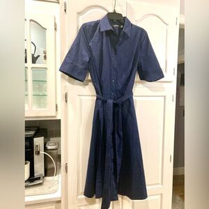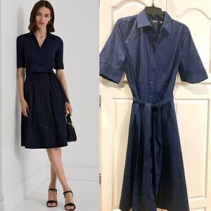 LAUREN Ralph Lauren Belted Cotton-Blend Shirtdress Navy Blue Size 8