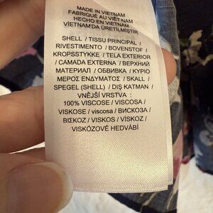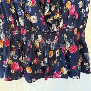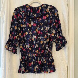 Beautiful shirt in great preowned condition. Ruffle trim, bell sleeves, smocked waist, navy with floral print. Size medium.