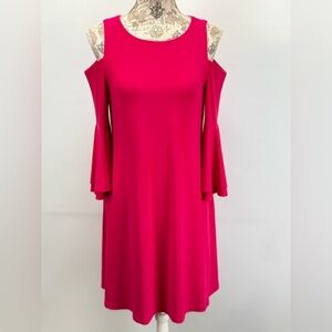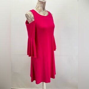 Hot pink cold shoulder midi dress from Lauren RL Black Label, size 4, features long bell sleeves, scoop neckline and forgiving stretch fabric. Perfect for any event.
