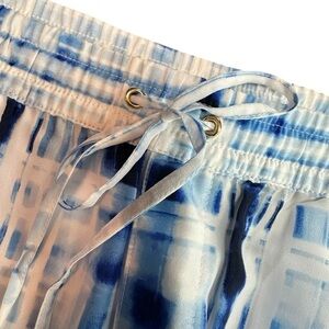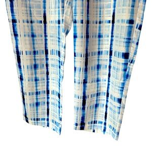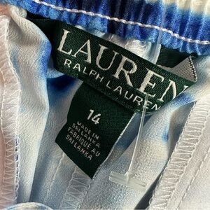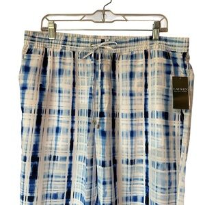 Lauren Ralph Lauren women's pants, featuring a blue and white tie-dye plaid pattern and a drawstring waist.
