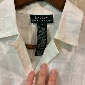 Beautiful crisp white linen blouse by Lauren Ralph Lauren. Subtle plaid print woven into the fabric adds flair, and the embroidered emblem on the chest pocket feels classy. Amazing quality garment with all beautifully finished seams and very straight lines. Like new without tags.