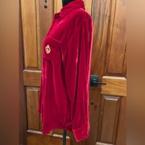 LAUREN Ralph Lauren Red Velvet Blouse Silk Blend Small Petite Gold Logo Crest